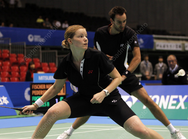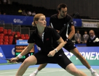 The longest and most competitive match of the first half of the day saw Laura Choinet / Weny Rahmawati (pictured) of France take one game before Mizuki Fujii / Reika Kakiiwa, benefiting from the support of a small cheering contingent from NEC, on whose corporate team the two play in Japan, came back to win in three. Toward the end of the 78-minute match, the whole crowd was inspired by the gutsy play of both pairs and was particularly applauding the jump smashes of Weny Rahmawati as the French pair made a desperate attempt to get back into the deciding game. Fujii/Kakiiwa finally took it, though, 21-23, 21-17, 21-18.