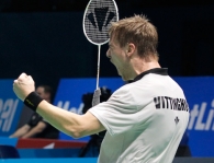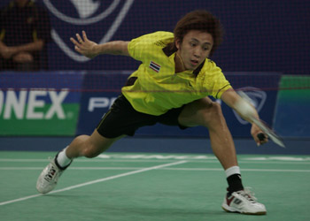 In singles, Salakjit Ponsana was completely outclassed by Korea’s Bae Youn Joo, fresh off her victory over Zhou Mi yesterday. However, the Thai men fared better, eventually. Both Boonsak Ponsana and Tanongsak Saensomboonsuk dropped a game against their respective opponents but while Boonsak won his next two handily over England’s Andrew Smith, Tanongsak (pictured) had to work very hard for nearly an hour, stretching his gangly frame all over the court to retrieve the best Przemyslaw Wacha could fire at him and contorting in mid-air to turn unlikely situations into attacking opportunities. The 19-year-old finally finished it 19-21, 21-15, 21-17.