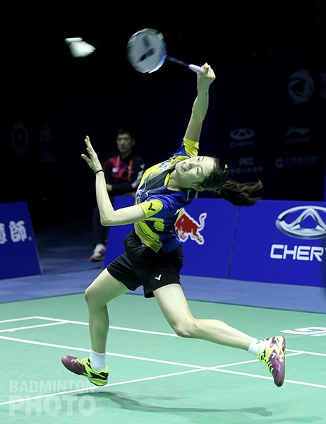 As for the matches China did have to play, on adjacent courts early in the day, two Chinese favourites were struggling to stay ahead of their challengers. Wang Lin (pictured) had herself been forced to chase Korea’s Bae Seung Hee throughout much of their first game but pulled away just in time to take it 21-17. In the second, Bae continued to chase down every shot and had enough luck at the net that she was able to catch and pass Wang at 16-15 but she just couldn’t stay consistent and Wang finished it up 21-18 and avoided the fate suffered last week by her similarly-named compatriot Wang Xin.