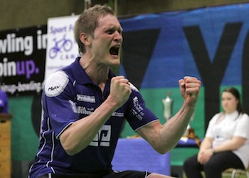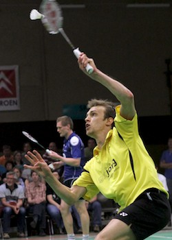 Marc Zwiebler (pictured below) proved again that he plays a spectacular doubles game, winning both matches with Rajiv Ouseph. But even his two straight victories against Kestutis Navickas didn’t help his team to get the “Hans-Riegel-Pokal”, the trophy named after the Haribo company’s famous founder, who was also German champion and president of the German association in the fifties.