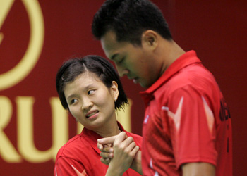 Taking on the baton from their compatriots, Muhammad Rijal / Debby Susanto (photo) was next to create an upset against sixth seeded Nathan Robertson / Jenny Wallwork. It was a surprisingly easy win for the pair ranked 44th in the world as the English pair seemed to simply give up the match in 21-12, 21-13.