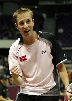 Singapore Open is saved from losing both its top two seeds in men’s singles as Peter Gade (photo) from Denmark managed to edge another Indonesian quarter-finalist, Simon Santoso. Peter squeezed through the 67-minute match in 17-21, 21-8, 21-17.