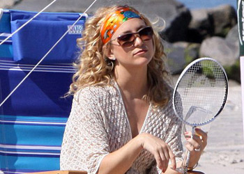 World famous actress Kate Hudson was seen playing badminton in the shooting set of her new movie “Something Borrowed” on the beaches of New York City. Sporting a pretty cream dress over a bikini with a multi-coloured headband in her hair, Kate seemed to be enjoying herself as she laughed and joked with her opponent, co-star John Krasinski.