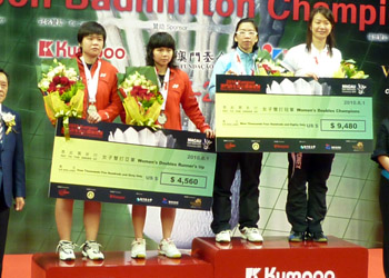 There were some uncertain line calls for both sides in the men’s doubles final and the match was a very close one. Both sides dived to save drop shots and smashes but it was Ko Sung Hyun / Yoo Yeon Seong (photo) who finally beat Alvent Yulianto Chandra / Hendra Aprida Gunawan. With the 7000 points from the victory, Ko/Yoo are about to take a big leap closer to the Top 10 in world ranking. Although they couldn’t communicate with the local press, they showed how delighted they were after the match in the photo taken for Badzine readers exclusively.