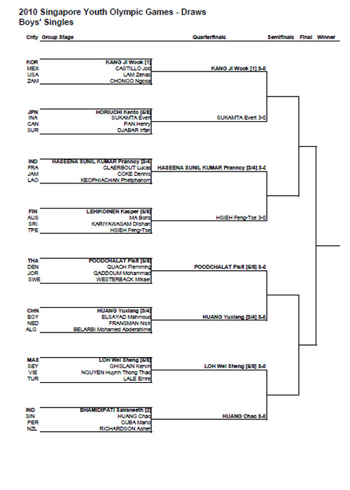 “Though the drift is strong in the stadium, I have already got used to the court condition and adjusted well,” said Loh on his readiness for the quarter-final. Loh was runner-up at this year AJC where he lost to the eventual champion, Huang Yixiang. He did not fare well in the World Juniors, losing in the third round. He prefers to take these Youth Olympics on a match by match basis, as having no target means no extra pressure. He had beat Pisit Poodchalat of Thailand in this year AJC. If he can beat Huang Chao in the quarter-finals, he is prepared to meet either Pisit or Yixiang.