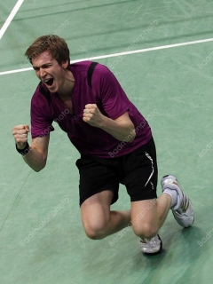 Anyone hoping to see a “dream final” between Taufik and Peter Gade didn’t get their wish as the latter was beaten in three games by compatriot Joachim Persson (photo). Peter Gade, whose participation in the tournament was in doubt last week because of a back injury, lost the first game 14-21 after some positive play from Joachim. With the crowd urging him on, Peter then managed to surge ahead midway through the second game to force a decider. Just when it looked as though Peter might have found his rhythm, Joachim displayed more commitment in his attacking play and it finally paid dividends for the 27-year old as he won the third game 21-17. It was the first win for Joachim against his more illustrious compatriot in international competition and what better way to do it than in a Super Series semi-final?