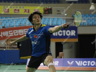 Bao Chunlai (pictured) was just as decisive as Wang in his first game against Japan’s Takuma Ueda. But it was Ueda who lead throughout most of the second. However, Bao appeared to reveal that he might have been playing a dangerous game of nonchalant catch-up and he finally put the hammer down when, trailing 12-15, he put together a 7-point run to pull within earshot of the victory. Earshot is right, too, because in a seeming effort to pump himself up to the challenge, he began to punctuate his smashes with tennis-style vociferations. Takuma still got back into it after that, but he never reached game point and Bao finished it up 21-13, 22-20.