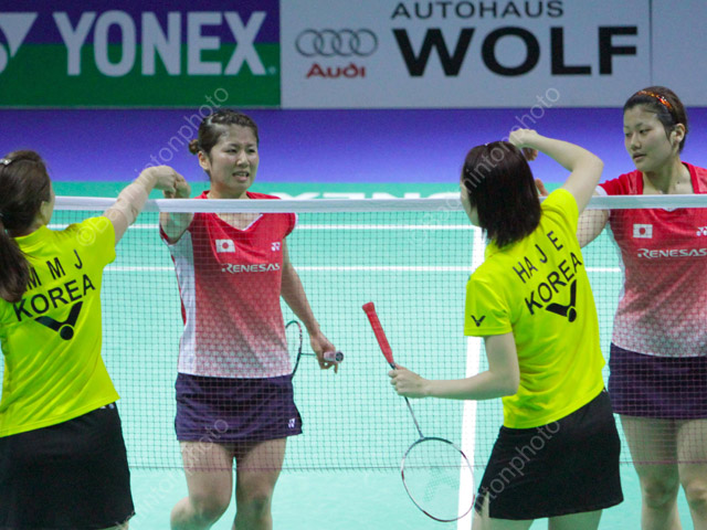 Nothing compared to the almost effortless victory of Mizuki Fujii and Reika Kakiiwa (pictured) against (another) Korean pair Kim Min Jung / Ha Jung Eun. The Japanese pair held their adversaries to as little as six points in the entire first game. Another early lead established in game two was enough to put them on course to securing the title with a 21-14 win. The twosome has fond memories of some earlier trips to Europe. Last year, they made it to the semi-finals of the Denmark Open and won the Dutch Open. At the All England, they’ll probably face second-seeded compatriots Miyuki Maeda / Satoko Suetsuna in the second round.