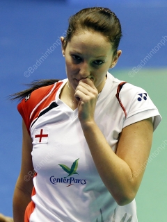 While England’s Jenny Wallwork (photo) and Nathan Robertson was defeated by Joachim Fischer / Christinna Pedersen in the mixed doubles – not without a great start – Kenneth Jonassen, former men’s singles of Denmark, stepped up to coach England’s Rajiv Ouseph to play against Denmark’s very own Peter Gade (photo).