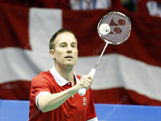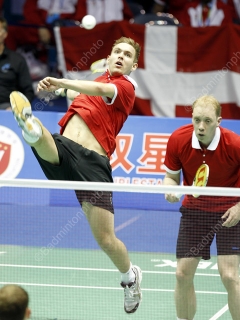 England’s best men’s doubles pair of Andrew Ellis / Chris Adcock, who were put to action against Jonas Rasmussen / Mads Conrad-Petersen (photo), almost had the better of the Danes in the third tie between the two teams. England’s hope of a point kept glinting until the moment they were announced defeated by a close twist from the Danes at the very end of the game. They lost in 21-16, 15-21 and a so-far-yet-so-near 21-23 in the rubber game after wasting two match points at 20-18.
