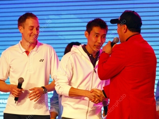 What do Lin Dan, Lee Chong Wei and Peter Gade have in common? They were the surprise guests in the chorus of the welcoming song performed by Li Yongbo at the opening ceremony of the Double Star BWF 2011 Sudirman Cup. Gade looked comfortable following the rhythm – if not the words in Chinese – while Chong Wei and Lin Dan were holding the lyrics sheets in their hands to follow their chorus mates, Cai Yun, Fu Haifeng and Bao Chunlai, who obviously knew their coach’s lyrics by heart.
