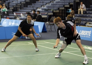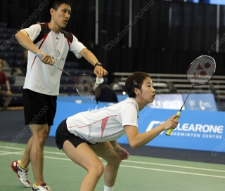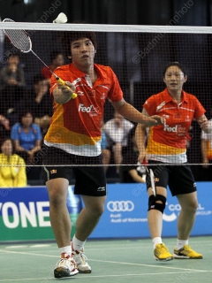 Uncharacteristically for a Chinese national team player and for a player of his age and experience, Li Gen (pictured right with partner Luo Yu) seemed determined to demonstrate his racquet control with a lot of risky, fancy shots. Unfortunately for him, he was more than matched in both power and consistency by his Canadian counterpart, and Ng and Chan took it home 21-12, 21-17 in just 20 minutes.
