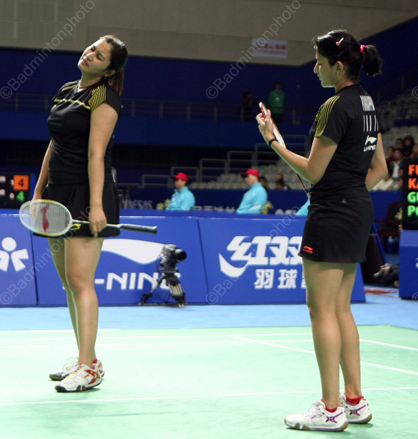 It was a similar case for women’s doubles. Only one of the three Japanese pairs in the quarter-finals were spared a bout with a home pair. Third-seeded Mizuki Fujii / Reika Kakiiwa disposed of Jwala Gutta / Ashwini Ponnappa (pictured below), and thus dashed the Indians’ hopes of making the Super Series Finals in December. Fujii/Kakiiwa will face top seeds Wang Xiaoli / Yu Yang. Tang Jinhua / Xia Huan will challenge the second seed Zhao Yunlei / Tian Qing.