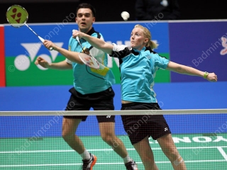 When Jenny Wallwork was warming up for her women’s doubles match together with Gabby White, she couldn’t refrain from taking quick looks at what was happening on the near court, where Chris Adcock and Imogen Bankier (photo) were about to create the upset of the day: they were serving with 4 match points in their racket against the world’s best pair of Zhang Nan and Zhao Yunlei: the very same pair which had beaten them in the final of the World Championships last year.
