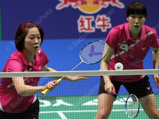True to herself, Ha Jung Eun showed off her fiery attacking side, embodied by the bright red hair she recently dyed. Alongside partner Kim Min Jung, (photo) the pair strove hard to place many shots past the Chinese pair. One however, should not forget that the Chinese have their own red as well, in the form of their red flag. Experienced Zhao Yunlei and partner Tian Qing were also just as ferocious in their attacks and managed to just take the first game 21-19. The fierce attacks continued into the second game and it was just a moment’s hesitation that cost the Koreans dearly, as Zhao and Tian smashed into another all-Chinese final. Wang Xiaoli, alongside Yu Yang, took down their juniors in 2 very short games lasting a mere total of 27 minutes.