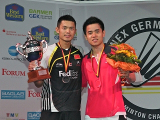 With four chances left to bag titles at the German Open, China took all four of them. Beside two more or less expected trophies for both Lin Dan and Li Xuerui in the singles, Xia Huan / Tang Jinhua and Hong Wei / Shen Ye stunned their Korean opponents in the doubles, leaving only one title for Denmark.