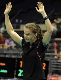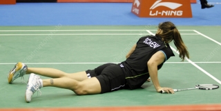 Today, Schenk was quicker in picking the shuttle from the net tape and kept Sung running to all the corners of the court. Schenk totally outclassed Sung in the net play today. Sung could do nothing to react to Schenk’s top spin net play that sent the shuttle sitting just on top of the net before crossing over. Schenk, who was diving all around the court to save the shuttles, earned herself a nickname of ‘German Super-Dan’ by the local fans. She likes putting on a show, the crowd loved it everytime she dived. It was such an entertaining match produced by Schenk and Sung. There is also something special with her today because she was wearing shorts today instead of a skirt which she usually wears.