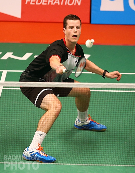 Even with the mixed doubles in hand, the tie was far from over, but fortunately for Japan, they had some strong contenders in both the boys’ singles and doubles. First up was Kento Momota. His opponent, Xue Song (pictured above left; Kento Momota right), lost in last year’s individual event to the eventual champion but he’s been virtually unheard-of since.