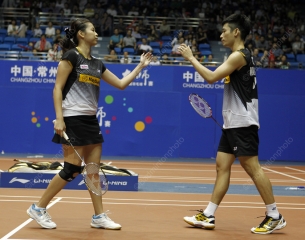 World number one mixed doubles pair Xu Chen / Ma Jin took the lead for China as they cleared up their opponents Anders Kristiansen and Julie Houmann in a quick, 33-minute match. Unfortunately the same could not be said of Tao Jiaming and Bao Yixin as they fell to 3rd-seeded Malaysians Chan Peng Soon and Goh Liu Ying (pictured left) in a longer lasting match of 53 minutes.