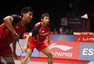 It was déjà vu for Akshay Dewalkar / Pranaav Jerry Chopra, who went up first for India when they saw history repeating itself, losing to Angga Pratama / Rian Agung Saputra (pictured above) of Indonesia in straight games. Dewalkar / Chopra had fallen short of beating the Indonesians in the first round of the Malaysia Open four months ago in the same venue. Failing to avenge that loss, they handed the court to PV Sindhu to take up against Lindaweni Fanetri in the women’s singles.
