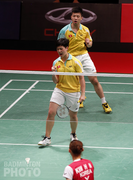 Hong Kong, being the only team in the elite group of the evening with their final shot at a pass to the quarter-finals, was eager to make their way past three-time champions Korea. World Junior Champion in boys’ doubles Lee Chun Hei, and his veteran mixed doubles partner Chau Hoi Wah (pictured above) outflanked the recent Asian Champions Ko Sung Hyun / Kim Ha Na (pictured below) in straight games to claim the opening point for Hong Kong. In fact, Lee and Chau were very close to upsetting Sudket Prapakamol / Saralee Thoungthongkam in their tie against Thailand last night.