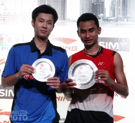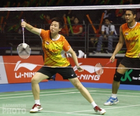 “It feels a little different playing here in Singapore than in Indonesia last week, especially since the crowd support feels really different,” said Mohammad Ahsan (pictured below with Hendra Setiawan). “However, we were already prepared to go all the way in this match since the Koreans are a very strong pair and I’m really grateful that we won in the end.”