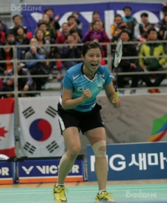 In fact, Bae came into today’s final as the only player in the top ten – apart from 18-year-old P.V. Sindhu – who had never won a Superseries title and one of only two top 15 players who had yet to win a Grand Prix event. She put all that behind her in Jeonju, though, when she beat Sung Ji Hyun (pictured below) in three tough games.