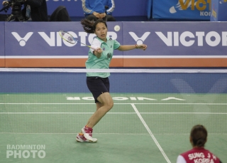 Sung Ji Hyun was the last member of the home team with a shot at a Sunday appearance but she came up short in the deciding game against 18-year-old World Champion Ratchanok Intanon (pictured left) of Thailand. Unsuccessful on a desperation line call challenge on the final point, Sung watched Ratchanok take the match 24-22, 11-21, 21-17.
