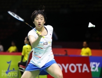 In the women’s singles final, Sung Ji Hyun blew a 16-7 lead in the first game before finally edging Wang 21-19. Another early lead in the second was extended when Sung’s string broke loud enough for the entire hall to hear and Wang Shixian continually pushed the shuttle to the back of the court, only to watch Sung maintain control and finally win the point.