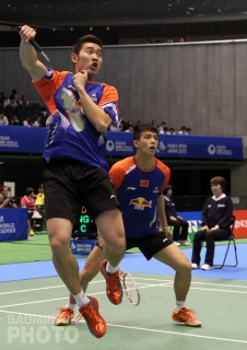 Wang Yilu (pictured above) began the day on Sunday with not one, but two, opportunities to take a title in the 2014 China Masters, but this time he came up short in both men’s and mixed doubles. In the men’s doubles, Kang Jun / Liu Cheng (pictured above right) successfully overcame Wang Yilu and Zhang Wen to get the first title of their partnership. Kang and Liu won in straight games over Wang and Zhang, whose first title together had been earlier this year, at the China International, where Wang had enjoyed his double doubles success.