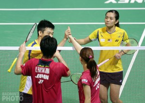 Having lost the second game in quick time and trailing 2-8 in the decider against the tournament’s 8th seeds Misaki Matsutomo / Kenichi Hayakawa (pictured shaking hands & wearing red) of Japan, Malaysia’s Lai Pei Jing / Chan Peng Soon (pictured wearing yellow) in their second Super Series as a pair pulled off an astounding upset before morning proceedings were over, 21-15, 8-21, 23-21.