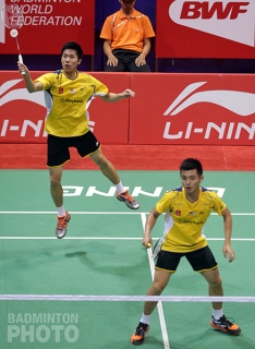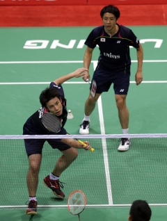 Malaysia entrusted 2004 World Junior Champion pair Hoon Thien How / Tan Boon Heong to stop Hiroyuki Endo / Kenichi Hayakawa (pictured right) in the next match. Hoon/Tan started off fierce, taking the first game 21-12, with Malaysian supporters at the stadium on their feet and roaring in support. However, Japan’s world #3 pair did not give in easily. They stole the second game 21-17, and survived the nerve-racking decider, winning it 21-19 to level up the tie.