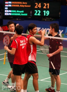 In another key match for the home team, Ricky Karanda Suwardi and Berry Angriawan advanced to the second round with a win over #3 seeds and two-time All England runners-up Hiroyuki Endo / Kenichi Hayakawa of Japan. The Indonesians played a tight game and finally the host representatives sent the Japanese players home early