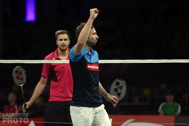 It was a repeat battle of the giants. Four of the biggest men at the tournament took to the court to replay their battle from the European Championship in April. But while Vladimir Ivanov and Ivan Sozonov had home court advantage on that occasion, it was Mads Conrad-Petersen and Mads Pieler Kolding (pictured above) who held home turf this time and they made the most of it, winning both games by 21-18 and advancing to face the 11th seeds Pratama/Saputra in the second round.