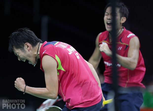 Denmark had a near perfect day. Only Kim Astrup Sorensen and Anders Skaarup Rasmussen were shown the door. The pair had a match point in the second game but couldn’t finish it off and allowed Chen Hung Ling and Lu Chia Pin (pictured above) of Chinese Taipei to begin the World Championships with an upset for the second year in a row. Chen and Lu now advance to the second round to face Hong Wei – whom they beat in their opening match in 2013 – playing this year with Chai Biao.
