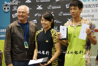 Both sides strode into the men’s doubles finals having unseated Oceania’s finest pairs along the way. Top seed Kevin Dennerly Minturn / Oliver Leydon Davis and 2nd seeded Matthew Chau / Sawan Serasinghe both fell, to Chinese Taipei pair Po Li Wei / Yang Ming Tse and Ruud Bosch / Tien Tzu Chieh (pictured) respectively. A tired Bosch, who had earlier experienced the bitter taste of defeat, was not willing to do so again, even turning to diving acrobatics to return the shuttle. However, his tiredness made him a prime target for Li Wei and Ming Tse, who targeted him at every opportunity. A favoured tactic was to put Tzu Chieh out of position, force Bosch to extend his coverage, then hit at the gaps or target a single person for a smash barrage.
