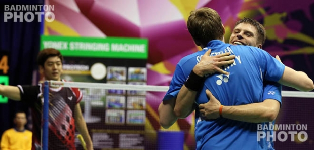 A very elated Michael Fuchs together with partner Johannes Schoettler (pictured top) produced the last and biggest upset of the day when they eliminated world #1s Lee Yong Dae / Yoo Yeon Seong in another 3-game match. They thus denied the in-form Koreans a 9th straight final appearance.
