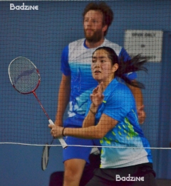 Doubles specialist Leanne Choo had to contend with Kiwi counterpart Oliver Leydon Davis as they both strived to take the opening mixed doubles match as the first part of their double crown. Both of them had their trusty partners, Robin Middleton (pictured right) and Danielle Tahuri respectively, to cover their corners and angles.