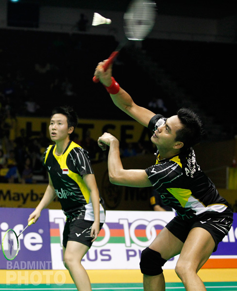 Liliyana Natsir and Tontowi Ahmad (pictured) could not get the better of World Champions Zhao Yunlei and Zhang Nan (pictured below) and lost their semi-final match 19-21, 21-14 11-21. This is the Indonesian pair’s 8th defeat in total to the Chinese pair and they just could not avenge their final stage loss in the All England this year to the same Chinese pair.