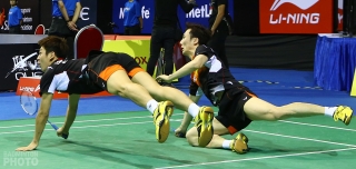 Lee Yong Dae and Yoo Yeon Seong (photo) were the surprise losers of this quarter-final stage as the top seeds went down to an inspired and ever-jumping duo of Pratama and Suwardi. The top-seeded Koreans did all they could to keep the shuttles alive – including diving in tandem on a few occasions, but the Indonesians were to be in the limelight and played a perfect game to enter the semi-final, edging the mighty Koreans 21-18, 21-19 after a thriller.