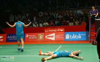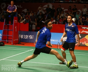 They had to wait all day but the spectators at the Istora Senayan in Jakarta finally got what they had been waiting for. Shortly before midnight, Asian Games gold medallists Hendra Setiawan and Mohammad Ahsan (pictured) beat the world #1 Lee Yong Dae and Yoo Yeon Seong to ensure there would be Indonesians on court on finals day.