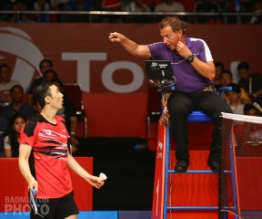 Then at 17-all, Yoo Yeon Seong (pictured) jumped to avoid a short serve from Hendra Setiawan and insisted that the call was out. Yoo also insisted on challenging the call but when the result came back as ‘no decision’, the call stood and the Indonesians were up 18-17.