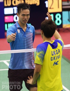 In the boys’ singles, Lu Chia Hung (pictured above) won the longest match of the day when he became the first to beat a defending champion. He won out over Lin Guipu 21-18 in their deciding game. Lu will now take on Japan’s Koki Watanabe. Watanabe, who also beat Lin in the mixed team competition has already beaten the only other junior to have beaten the defending champion when he eliminated Cheam June Wei earlier in the week.