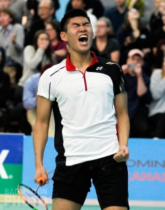 Veterans Adrian Liu and Derrick Ng (pictured) then came on court to successfully defend their men’s doubles title. They encountered strong opposition from Derrick’s brother Toby Ng and Philippe Charron – the only player from Québec still alive in the ultimate round – but the team from British Columbia won their sixth consecutive title in their event, a record in Canadian badminton.