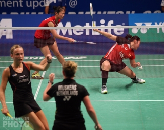 The first Indonesians to start their quest for a week-end ticket were Tiara Rosalia Nuraidah and Rizki Amelia Pradipta, who were facing the world #11 Eefje Muskens & Selena Piek. Nuraidah/Pradipta started the game very confident with amazing support from the crowd. The Dutch players couldn’t control their game and lost 10-21 in the first game. With a clear will to fight back, Muskens/Piek started to attack in the second game while the Indonesian were starting to make some errors and the Dutch ladies were able to edge out the home pair 24-22 to send it to a decider. The last game was a thriller but went the Dutch way 25-23.
