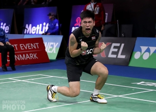 Home hopes in singles evaporated earlier in the evening when 19-year-old Anders Antonsen – after evening the match at one game apiece and sticking close up to 13-14 in the third – allowed Tanongsak Saensomboonsuk (pictured above) to go on a six-point run that proved decisive.