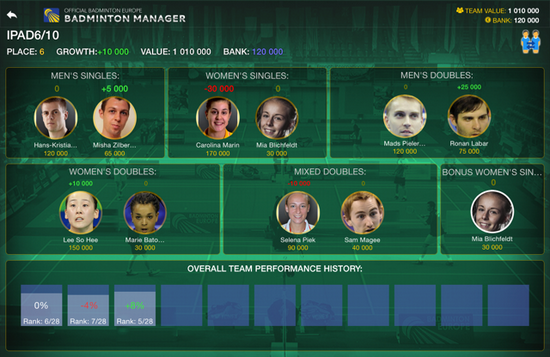 Badminton Europe is launching its second version of its mobile application Badminton Manager, for fans around the world who would like to see how they would fare as a badminton coach. The concept is simple – and free (with paying options) : you have US$1,000,000 to spend on “hiring” your team composed of 8 players – 2 singles and 3 doubles. You can get top players (US$200,000 each for someone like Carolina Marin or Lee Chong Wei), but you can also opt for cheaper but upcoming stars. Once you team is set, you just have to see how they fare in real life to get points. The winners after the season will get some lucky prizes thanks to Badminton Europe’s partner.