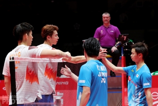 Their rematch against Wang Yilyu and Huang Dongping (pictured left) – whose loss to the world #1 pair in the World Championship final was just one of 7 to their Sunday opponents in Guangzhou – was a thriller. The first game was perilously close but the world #2 scraped by with a 23-21 win.