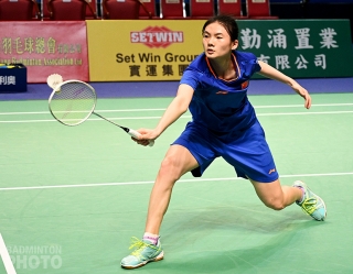 This time, however, Japan did not have either of its two top 5 women’s singles aces to rely on to seal the deal against China. Even so, it was a very even contest between each team’s 3rd-ranked player: world #12 Sayaka Takahashi for Japan against #14 Han Yue (pictured below) of China. The 19-year-old Han bounced back from dropping the first game to win the longest match of the afternoon, beating Takahashi 21-17 in the decider.