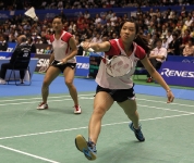 Thai fans, neither numerous nor noisy during the qualifying matches, really came alive as the main draw got going. In the opening match, home favourites Puttita Supajirakul / Sapsiree Taerattanachai gave them something to cheer about when they put the screws to World Champions Matsumoto/Nagahara and dominated their second game. Those hopes dissipated by the decider, when the Japanese pair ran away with it 21-6.
